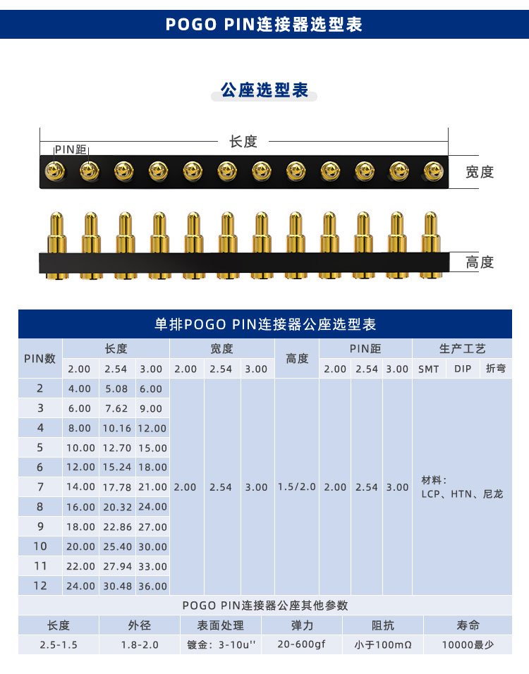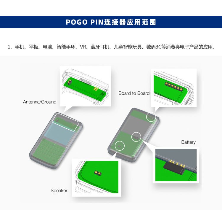 Profesionaliai projektuojame, gaminame ir parduodame mobiliųjų telefonų „Pogo Pin“ įkrovimo kaiščius, akumuliatoriaus kaiščius, antenos kaiščius ir kitus „pogo“ kaiščius bei jungtis. Didelės srovės įkrovimo kaištis Vyriškos ir moteriškos jungtys turi mažo dydžio, didelės srovės, stiprių kontaktų ir stabilaus veikimo charakteristikas.